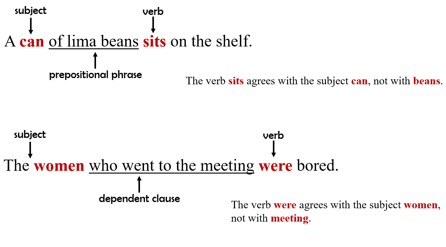Subjects and verbs must AGREE with one another in number (singular or plural). Thus, if a subject is singular, its verb must also be singular; if a subject is plural, its verb must also be plural.In present tenses, nouns and verbs form plurals in opposite ways: